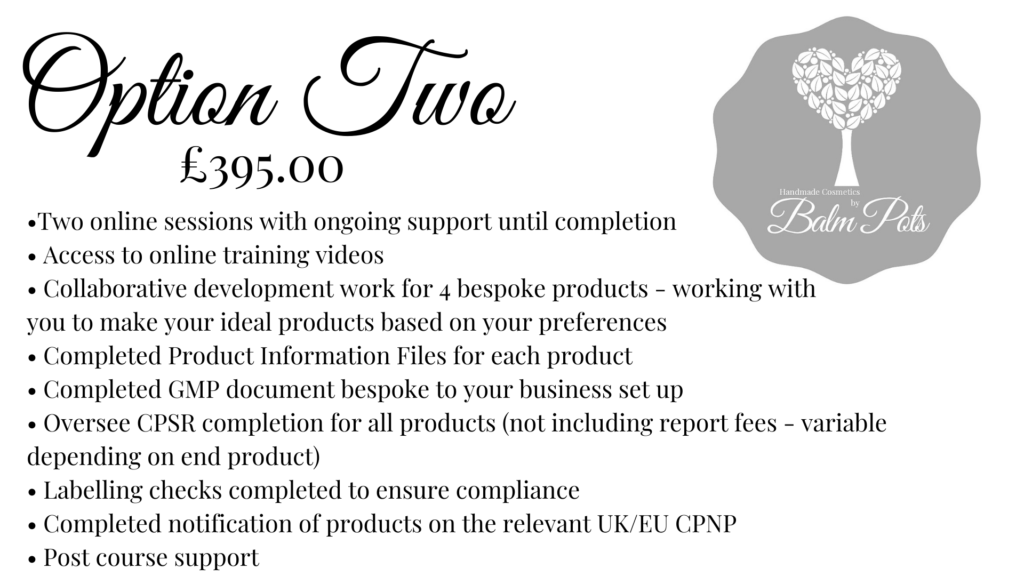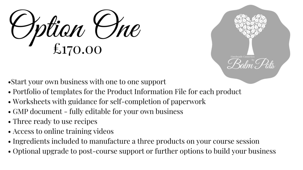During Option One & Two you will become familiar with the necessary legalities including guidance on Cosmetic Safety Reports (CPSR), UK/EU Cosmetic Product Notification Portal (CPNP), Good Manufacturing Practices. You will also learn what is needed for cosmetic labelling compliance, insurance and receive a marketing guide for your new business.