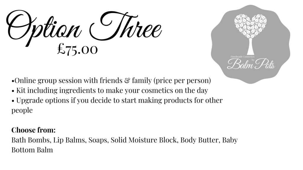 Option Three is for fun! Learn how to make cosmetics with friends and family online in an interactive session. Various options are available from bath bombs to lip balms.